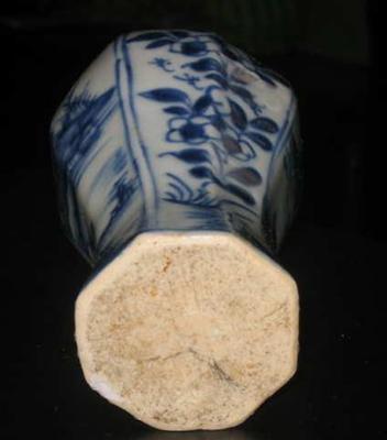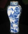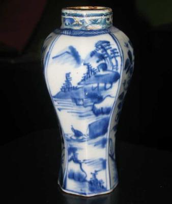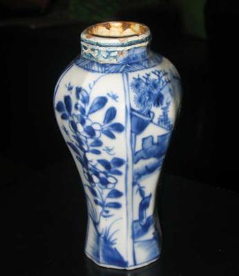 A mid 17th century about 1660 Chinese Ming / Qing vase. The real work is old. Decorated with a scene in four areas with two different sets of figure standing on the waterfront, cottage, floral decoration and mountains in the background and figure kneeling at the waterfront in a similar backdrop. Both images are mirrored to each other. The smooth area between floral decoration. Height about 14.3 cm. Condition: Old restorations on the shoulder of the vase. For me, this is certainly its charm! Furthermore, small flake base rate - not really noticeable when he stands. No hairlines. Nevertheless, a very nice and especially very old vase in a rare period. Also recognized as an early 17th century the typical flat bottom.