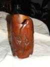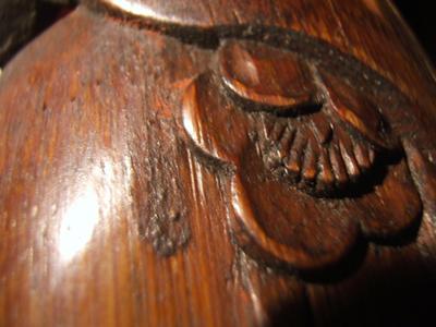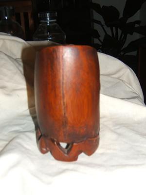 is 135 mm.s high; has an old, infilled repair of a full length vertical split on the back, where there is no carving.
