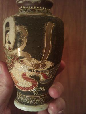 Hi Peter, I came across a pair of these vases while clearing my parents house. They're about 5-6 inches tall and a "reverse" of each other in terms of the imagery. They look Chinese, although to my (untrained) eye the woman might be Japanese. The painting / decoration is very raised. The mark on the bottom is indistinct. Thanks for any help.