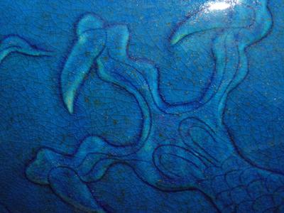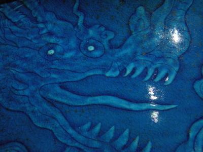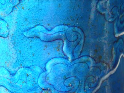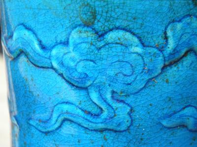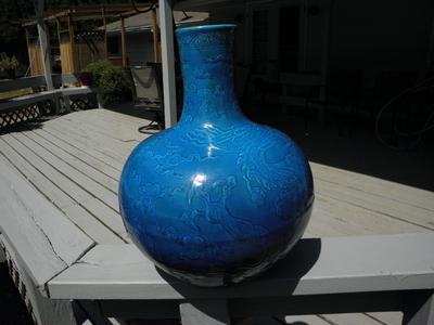 Hi Peter, another addition to my collection, this is a large 17" high monochrome blue vase and it is 12-1/2" wide, I bought several pieces from an antique dealer, again I was told that he thought this to be 19th century, I do not know much about Monochrome Chinese antiques, although it is made of porcelain and there is a lot of age signs and I noticed that there is a bulge in the middle where it looks like it was made in two pieces and put together, it has a dragon and clouds, I would like to know the age and what you think, thanks again from Stan.