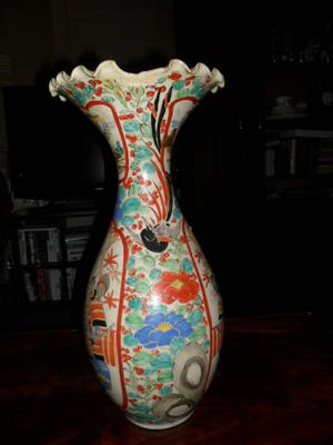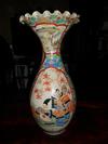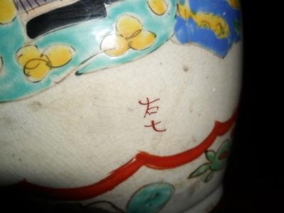 Hi Ping, I have some similar vases, some of the vases I have,have the same mark on the side, Maybe Peter can tell us what the marks mean, I think they might be a kiln mark or the makers mark, the ones I have are marked on the bottom with a six characher mark, made by Fukagawa, on all the early fukagawa vases that I have seen they also decorated the inside top usually with a flower decoration, is yours decorated inside the top rim, the ones that I have do not have a crackle glaze like yours, the crackle was made that way but usually by satsuma and the porcelain by satsuma had a tan color glaze with crackle, the fukagawa did samurai warriors and wemen in bright colors like yours and a ruffed top rim, from Stan.