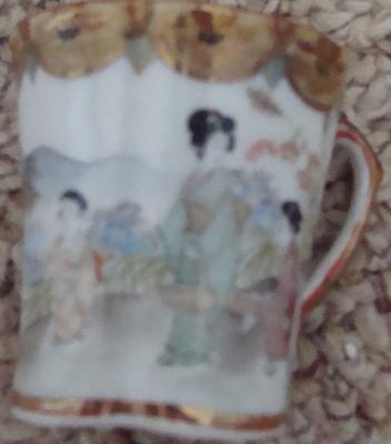 All pieces have identical marks, painted on. The cup mark has a gold boarder around with gold lettering and red back ground rather then the red mark on white, but it is also painted on and glazed over. The glaze is in very good condition not really cracked but I know this is more then 80 years old since it has been in my family longer then that. All have the same scene but different sides have different parts of the scene, so I have multiple pictures to see the whole picture.