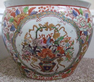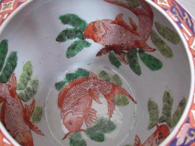 Grateful for help in solving my fishbowl mystery. The Imari-style flower basket pattern suggests it is Japanese, but I am inclined to think it Chinese. Still, the base markings are unusual, to say the least! Of the six Chinese characters, the last three read Year of the Dragon. I have never heard of a zodiac year like this on Japanese ceramics. On the other hand, there is no Chinese reign-era name. One possibility could be it was made after fall of the Qing, but my hunch is it is a bit older. Not sure of the first three characters. Their Japanese reading could be Giken-do or Yoshinori-do, the name, perhaps, of the potter or the shop that sold the fishbowl. The smaller marks near the rim do not appear to be Japanese or Chinese script.( I saw similar marks once on the back of an Arita plate.) One final thing: the white glaze is actually greyish.