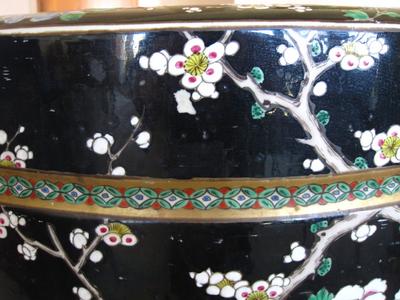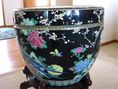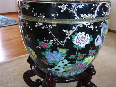"The picture which you sent to me can be properly identified. It is hard paste porcelain made in China and decorated in the background known as famille noire. I believe the piece to be used as a fish bowl and dates to the mid 19th century. The appearance of thickly applied paint makes me feel it is not an earlier version of the design. The replacement evaluation is about $3-4000. I am writing this from my summer home."