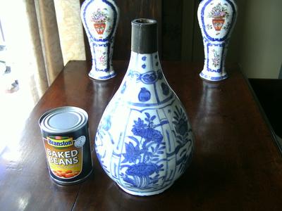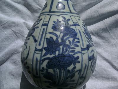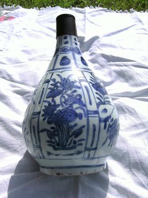 I am sorry if these enquiries of mine are beginning to get tedious but I have two more items I'd love to pick your brains about. Am I correct in thinking this is a Wanli Garlic neck bottle vase? ( having had the neck reduced and replaced with some sort of metal top) It certainly looks like the ones I have seen in my research online. The thing is the vast majority of info out there is more geared towards valuations than anything else. Does this look like a period one? What was its purpose purely decoration or as a vessel? Anything you could tell me I would really appreciate. Many thanks Andy. PS its about 10 inches tall