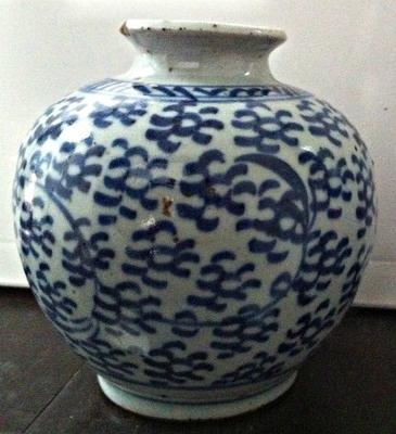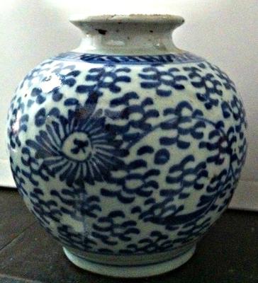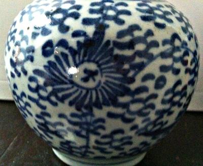 I had acquired this small old vase while on a visit to Bejing in 1989. It is well proportioned; the height and diameter are exactly the same, i.e. 4 inches each. The glaze shows impurities which are more pronounced on the unmarked bottom.