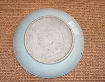 You kindly helped me with the first of two possibly Vietnamese plates I was given. The second has no markings of any kind on the reverse and the entire base and rim are unglazed. There are several cracks. The plate is 9 and 1/4 inches in diameter. Given the lack of glazing of the base I wonder if it's an older plate? Any information you might give on it would be appreciated. I don't know if the fact that it was owned by the same person as the possible Qing plate you already reviewed could provide any clues. Thanks.