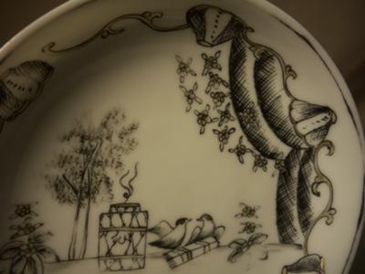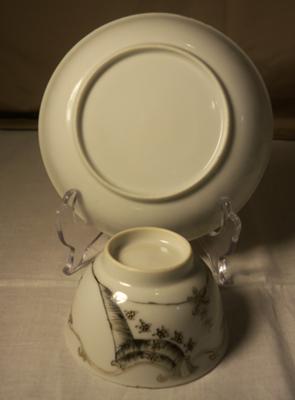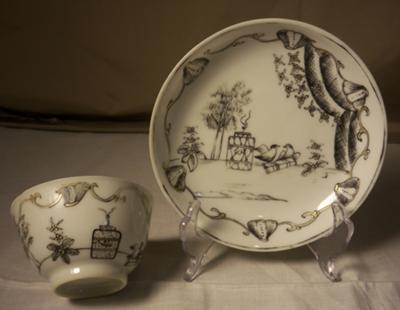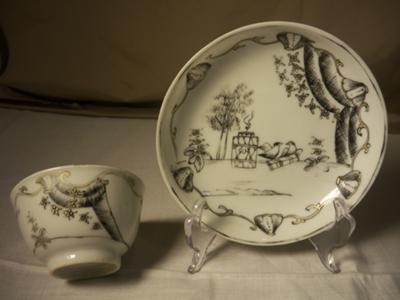 I am interested in the age and decoration of the tea cup and saucer. The drapery is not something I have often seen. I see this decoration in 18th century European buildings. Any and all information is appreciated.